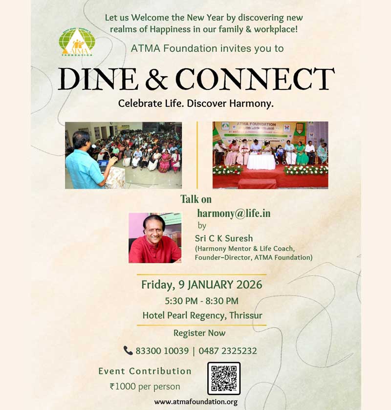 The “Living in Harmony” 5-day talk series, conducted by Sri C.K. Suresh, Founder-Director of ATMA Foundation, was successfully held from April 23rd to 27th, 2025, at Chinmaya Vidyalaya, Kolazhi. The sessions introduced participants to Living in Harmony—a practical philosophy for happy living, developed by Sri C.K. Suresh based on his extensive experience in management, psychology, spirituality, counselling, and social work. The series focused on simple yet powerful attitude changes and perceptual shifts that lead to personal transformation. Participants were guided to better understand their inner world and learn how to manage their responses to life’s external challenges with clarity and balance. The programme was well-received, offering valuable insights and tools that inspired reflection, growth, and a more harmonious way of living.